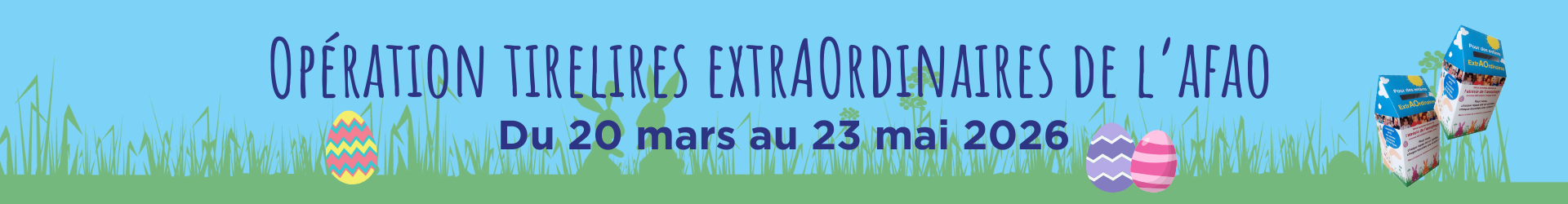 Depuis 12 ans maintenant à la période de Pâques, les bénévoles de l’AFAO déposent des tirelires chez des commerces gourmands (boulangers, chocolateries, mairies, écoles) afin de récolter des fonds pour l’AFAO. Cette petite opération locale, mise en place pour la première fois en 2014 par Lucie, notre déléguée Midi-Pyrénées, est aujourd’hui devenue un évènement d’ampleur nationale !